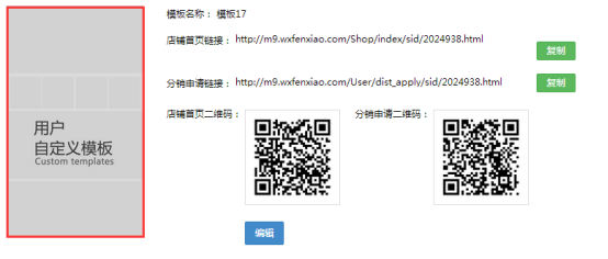 红框中,是用户当前正在使用的模板,当前我们使用的是“自定义模板”。右边可以点击“复制”按钮把店铺首页与分销申请的链接复制到导航菜单进行相关的链接设置。(注:推广用这个链接是锁定不了上下级关系)