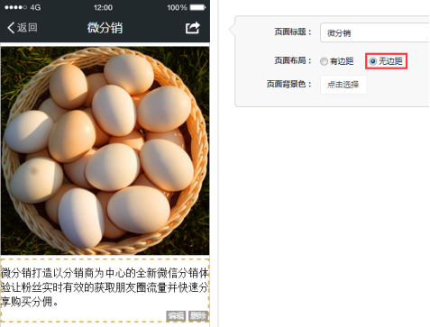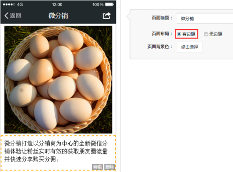 页面标题:即当前页面的标题修改,具体显示位置如上图红框所示。 页面布局设置分为:“有边距”和“无边距”两个选项。它是一个全局设置,控制整个页面文字、图片的左右边距。具体效果如下图所示: