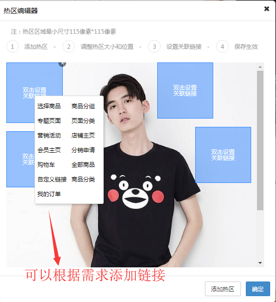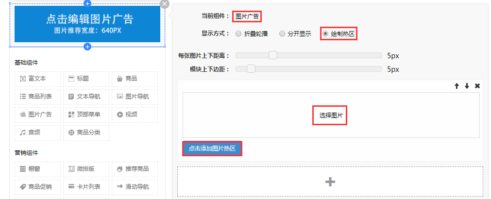 2.“图片广告”装修组件增加图片热区的功能,可以对一张图片的不同位置设置不同链接