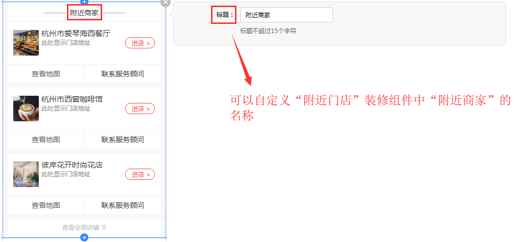 店铺首页“附近门店”装修组件中“附近商家”的名称可以自定义