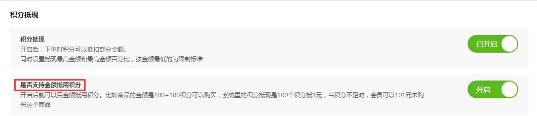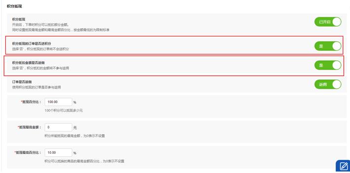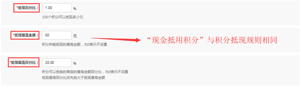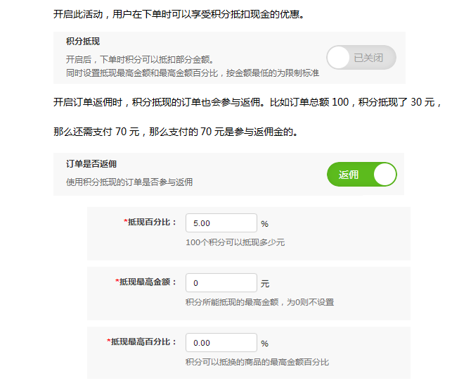 1.积分抵现开启后,下单时积分可以抵扣部分金额。同时设置抵现最高金额和最高金额百分比,按金额最低的为限制标准。