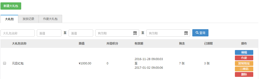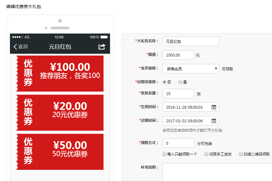 各种送优惠券的活动,选择优惠券时都可以选择大礼包,会员获得大礼包时将一次获得多张优惠券。比如活动是希望赠送会员面值2000元的优惠券,如果赠送一张2000元的优惠券,一次性用不完就浪费了。