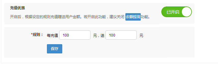 开启后,根据设定的规则充值赠送用户金额。若开启此功能,建议关闭 余额提现功能。