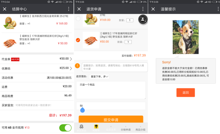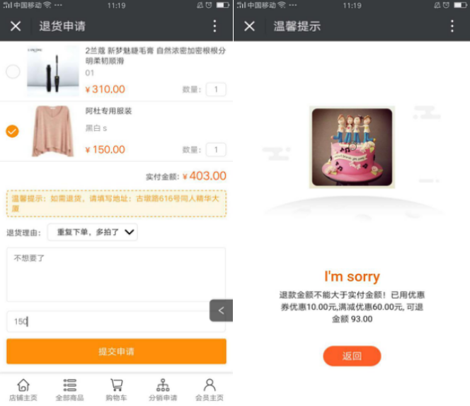 ·订单有参与优惠后,商品不能全额退款时,提示优惠了多少,可退多少