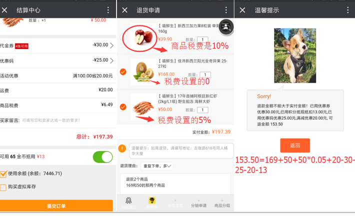 ·· 一个订单中多个商品:只退部分商品的话(商品的价格+商品税费+运费)-参与的优惠(积分抵现的/优惠券/优惠码/满减)=实际退的金额。