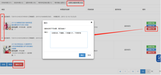 操作步骤: 总部后台→订单→售后服务→退换货审核:商家可以删除/批量删除已经处理完成的退换货申请订单,删除后,后台有日志记录,且不可恢复。