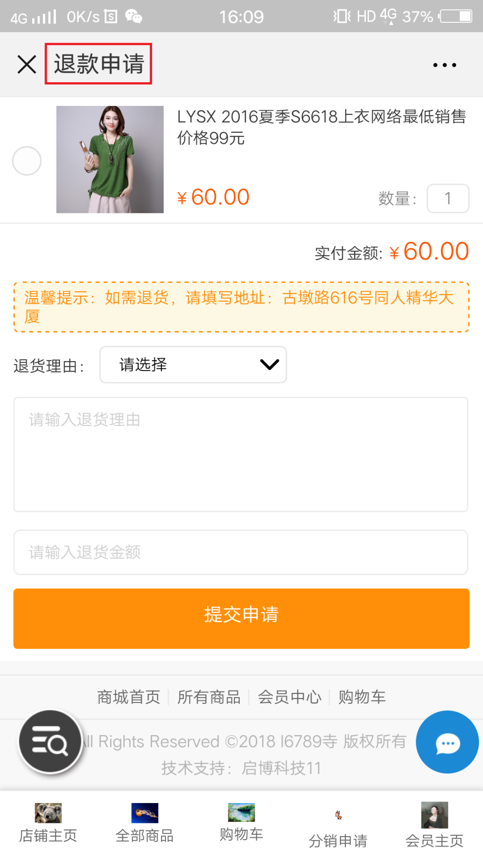 手机端购买商品申请退款(商品未发货的情况下),进入“退款申请”页面: