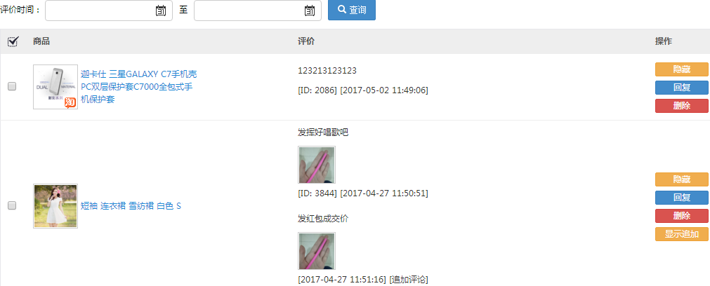 ·用户可以在商品评价中查看相关订单的评价,对于差评用户可以点击“隐藏”按钮进行隐藏。隐藏后仅评价方自己能看到,其它人均看不到。对于回复的内容可以点击“删除”按钮进行删除。