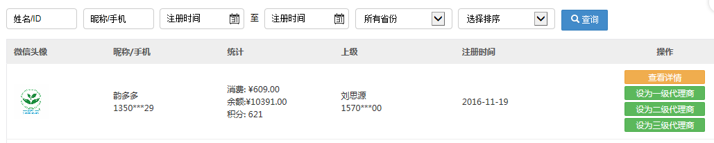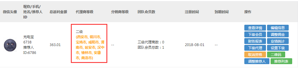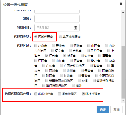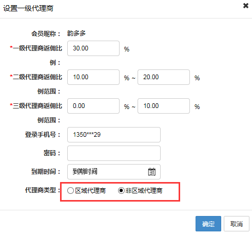 设置代理商:可以设置会员为什么等级的代理商,点击“设为一级代理”按钮,弹出设置框进行设置。设置好代理商的返佣比例,手机号,密码,到期时间,代理类型,确定即可。 这里应注意一下“代理商类型”如果是要分区域的代理,请选择区域代理商,勾选相对应的省市即可。