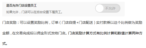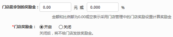 操作步骤: 总部后台→商品:发布商品或者编辑商品时“佣金设置”模块增加是否开启“门店奖励金”的配置项