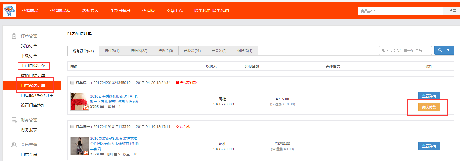 点击“门店订单”可以查看门店自提和配送的订单。 【新增】对于线下付款的订单,门店后台可以确认付款,便于会员付款给门店的情况 。