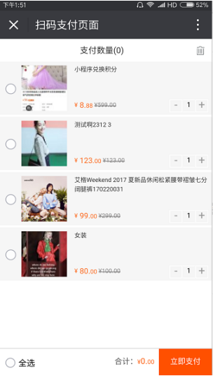 ① 扫码后,跳转到商品页面可以选择购买件数,点立即支付跳到微信支付