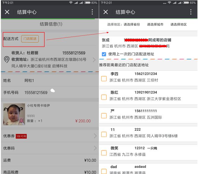 门店配送: 当配送方式只有门店配送方式时,结算时直接跳出门店配送地址
