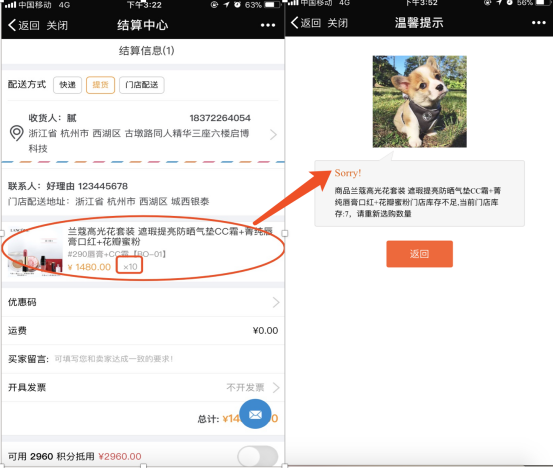 如果商品的门店库存不足,会员则不能下单,提示门店库存不足。