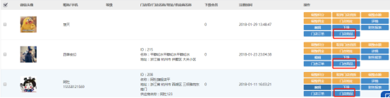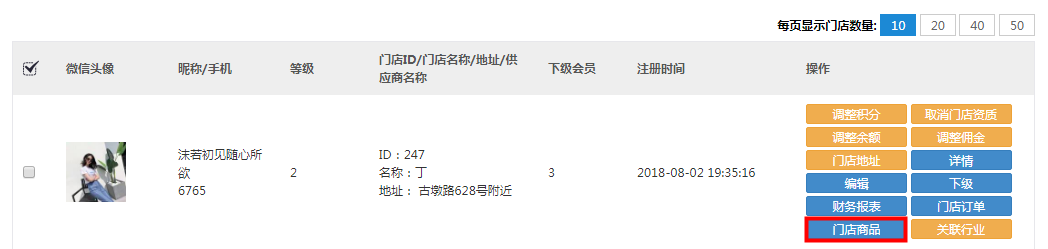 对所有门店进行相关管理,可以通过所在分组、下级人数、订单笔数进行查询。 操作区可对勾选的门店进行积分调整、订单、财务报表以及门店资质、地址等相关设置。