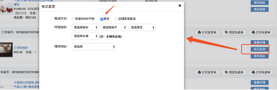 2、在订单标记发货、修改地址和手机端门店配送订单选择自提地址,显示门店名称。