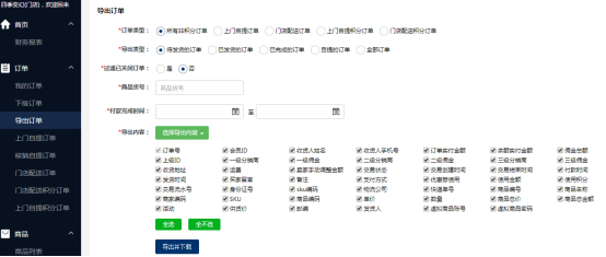 操作步骤: 门店后台→订单→导出订单:可以导出不同时间段,不同类型的订单,同时可根据需求选择需要导出的内容。