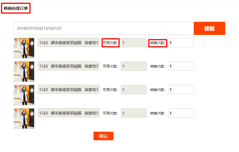操作步骤: 门店后台→订单→核销自提订单:门店后台扫码自提的订单时,可以获取到订单中商品的信息。下图中可用次数为订单商品的数量,核销次数(可以自己编辑,但不能大于可用次数),可用次数与商品名称无法被编辑。
