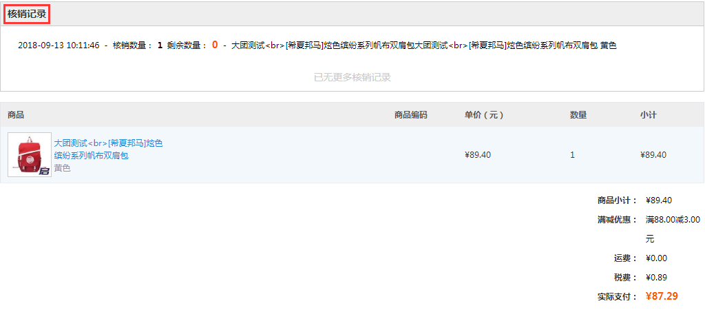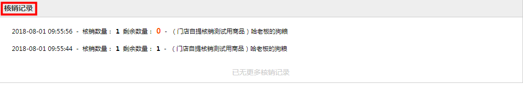 确认核销时,若核销数量和商品剩余数量一样,则交易完成,发放佣金;当所有的商品都被核销后,订单才会被自动执行确认订单操作。若订单有核销记录,将会在订单详情中显示所有核销记录。