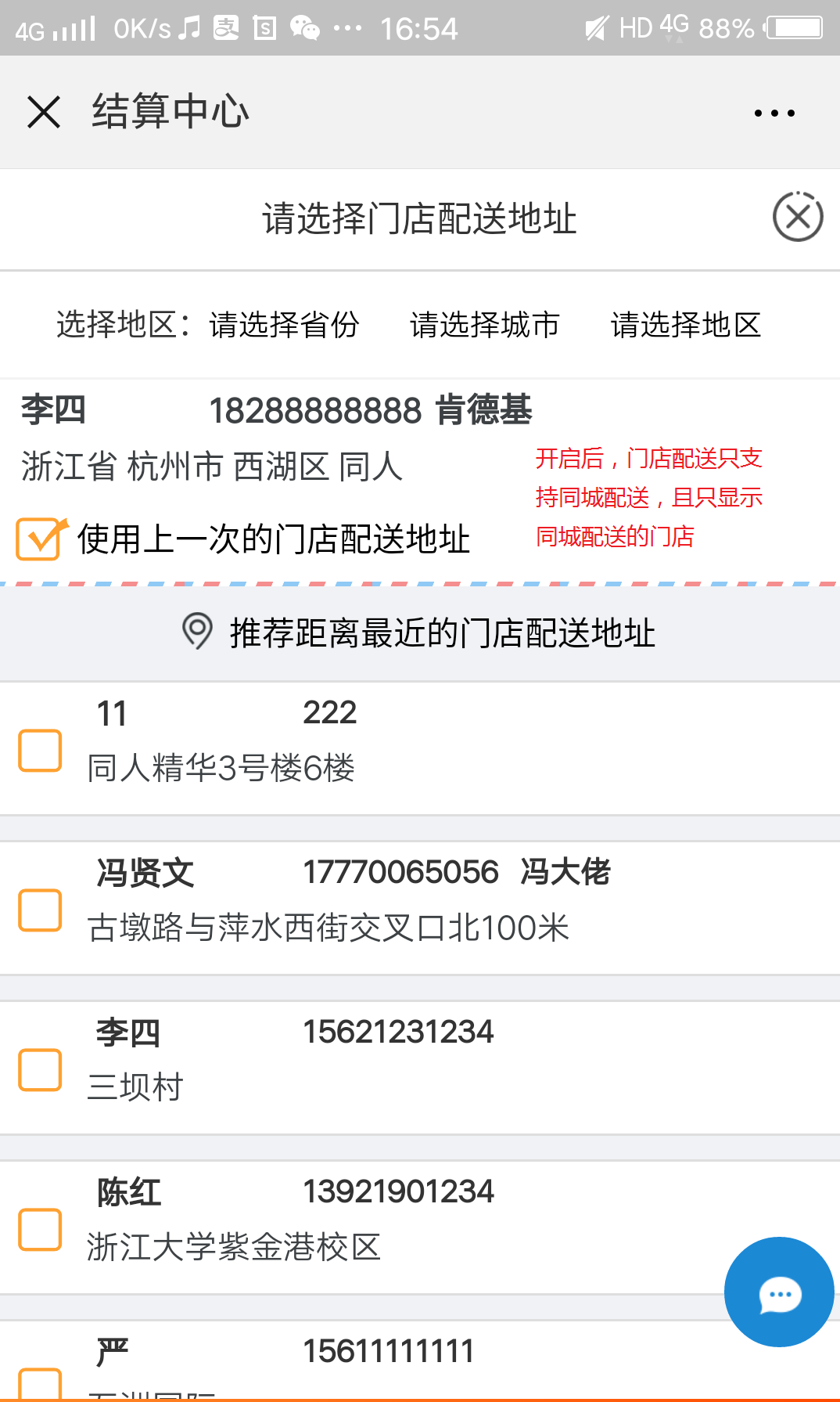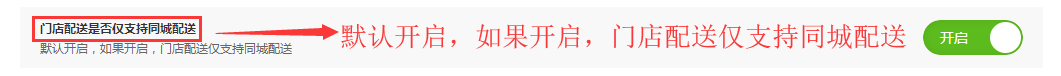 门店配送可以设置是否仅支持同城配送,开启后会员下单选择门店配送只显示同个城市的门店