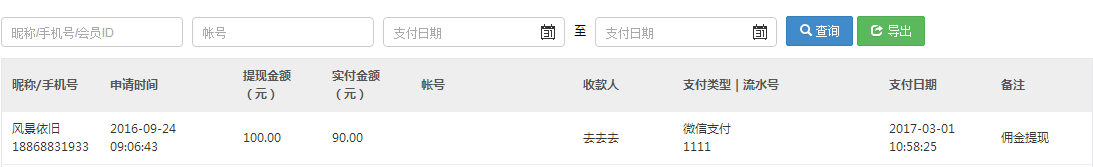 所有的发放记录,请到提现记录查看,可以根据昵称、手机号码、ID,账号,支付日期对提现记录进行导出。