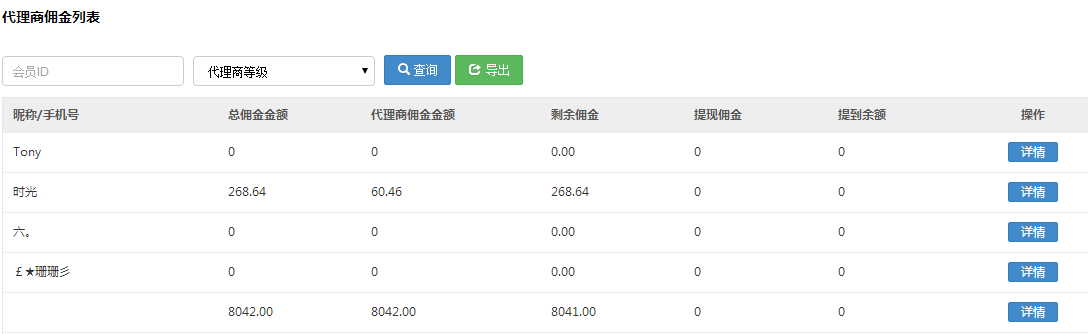 可以根据会员ID,代理商等级,对代理商佣金进行查询、导出,可以根据佣金的降序和升序进行排序,可以点击详情查看当前用户的个人信息。