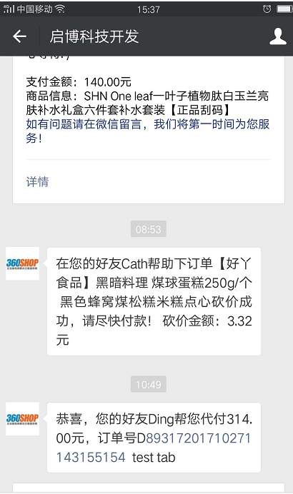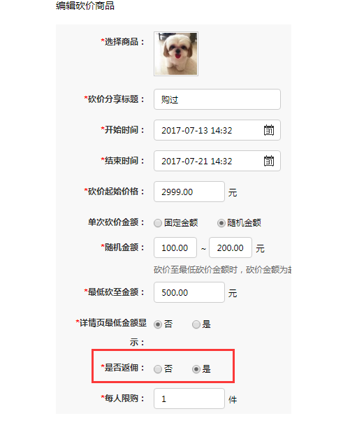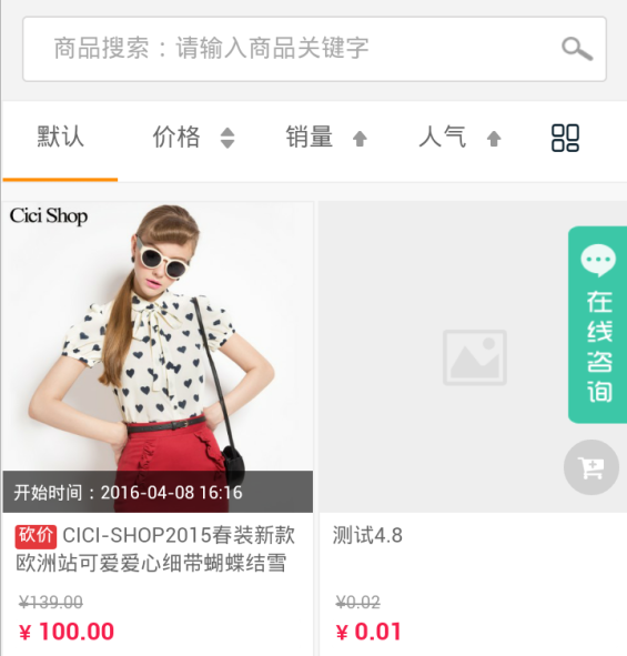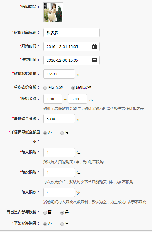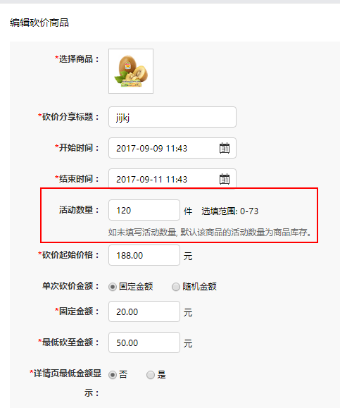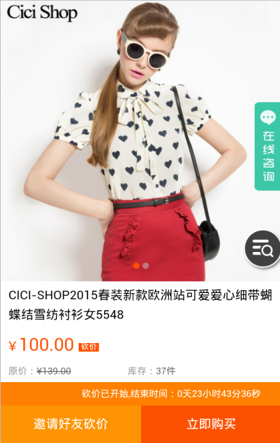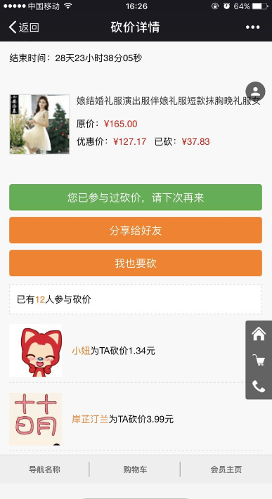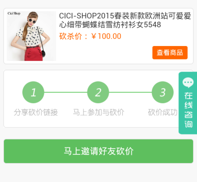 ·砍价活动可以设置每人限砍次数,用于限制一个人帮其他人砍价的次数 比如设置了每人限砍1次,A帮B砍过后,就不能再帮C砍了。 手机商品列表中,对参与砍价活动的商品在标题前会加上砍价的标志。商品详情页有显示砍价开启与结束的时间,点击“邀请好友砍价”进入砍价页面。 前端显示效果如下图: