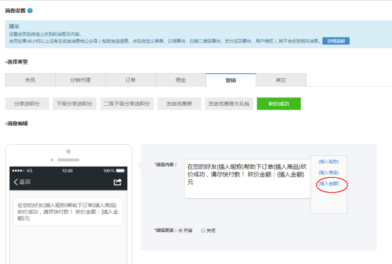 操作步骤: 总部后台→设置→微信设置→消息设置:营销中的“砍价成功”消息编辑增加“插入金额”变量。