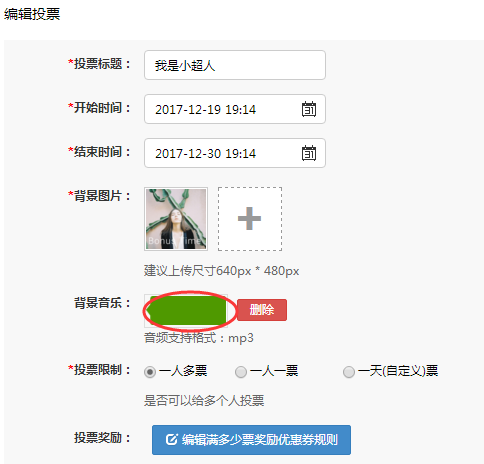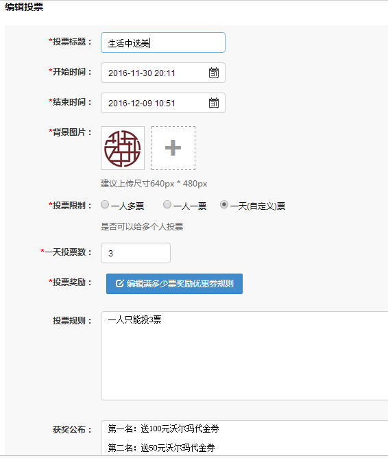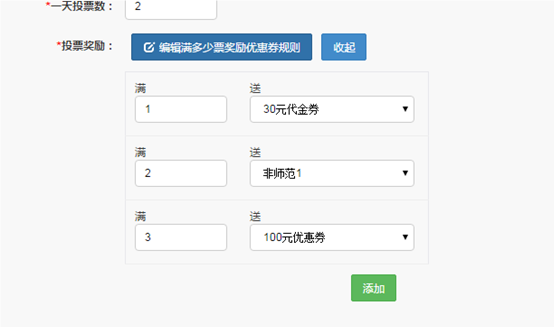 投票活动的限制增加“一天(自定义)票”,表示一个人每天可以投(自定义)票 投票活动可以设置满多少票后奖励哪张优惠券,鼓励参与者(报名者)去拉票 这个投票奖励是给报名人的,鼓励选手拉票的,只有当投票活动关闭或者结束了之后才会送,删除活动不会送。