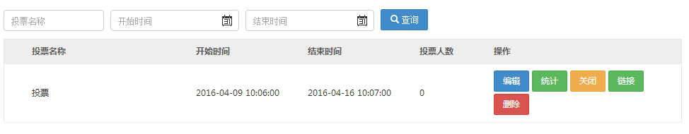 这个投票奖励是给报名人的,鼓励选手拉票的。比如设置满50,送30元代金券,满100送100元代金券。当报名人的被投票数满50时,送30元代金券,满100时,送100元优惠券。只会送一张不会说是叠加送的,达到相应的条件才会送相应的优惠券。只有当投票活动关闭或者结束了之后才会送,删除活动不会送。 活动设置完成保存,系统会自动跳转到列表页。在列表页我们可以在操作区对此活动进行相关的管理。如下图所示: