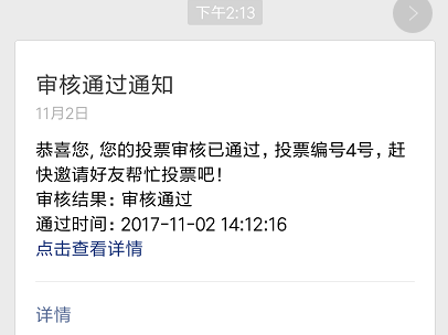 ① 投票审核通过通知:会员报名参加投票选举,申请后,商家审核通过后,会员就会收到通知,审核被拒绝后,则不会收到通知;
