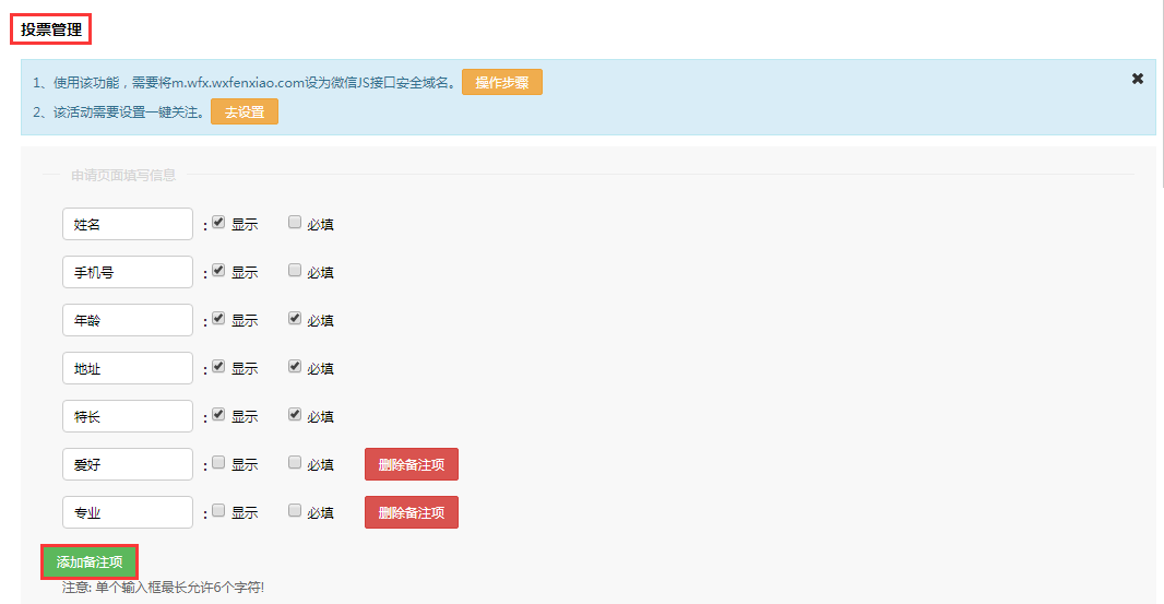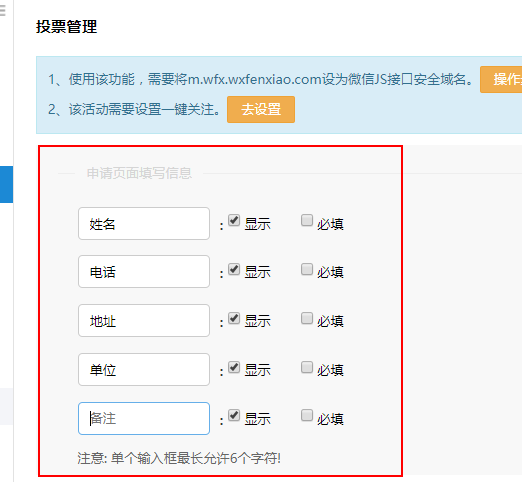 投票活动申请项可以设置自定义内容,可以根据需要添加需要在手机端显示的内容