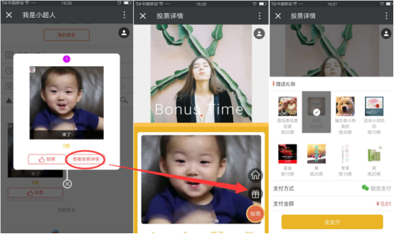 点击查看投票详情,点击礼物,选择要赠送的礼物,查看投票统计可以查看到投票的信息和礼物详情。
