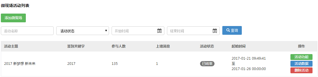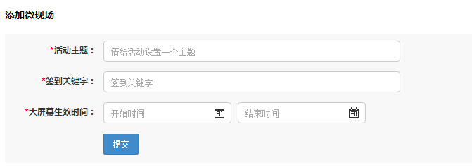 适用于线下活动现场,快速吸粉。 目前微分销系统拥有以下活动:现场抽奖、摇一摇、抢红包、投票。 活动流程:1、添加微现场。2、设置活动主题与关键字,活动开始时间。3、创建现场活动。 参与流程:1、关注公众账号。2、发送签到关键字。3、发送参与活动关键字参与活动即可。 点击【微现场】添加现场活动,如下图所示: