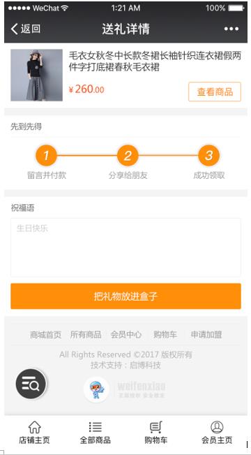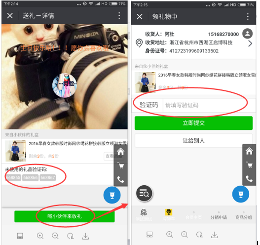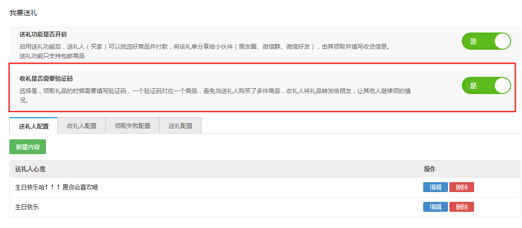 开启送礼是否需要验证码: 选择是,领取礼品的时候需要填写验证码,一个验证码对应一个商品,避免当送礼人购买了多件商品,收礼人将礼品转发给朋友,让其他人继续领的情况。