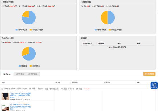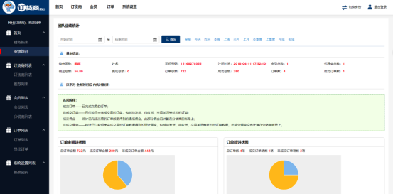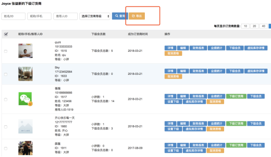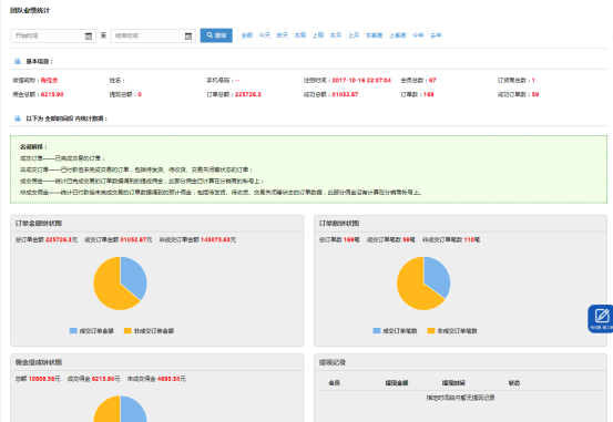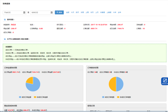 ① 财务报表:统计的是一条线上和自己佣金有关系的财务信息统计(除销售奖),中间外来的数据不会统计(因调整上下级关系带来的数据);订货商的财务报表(成功的订单)也可以导出来。