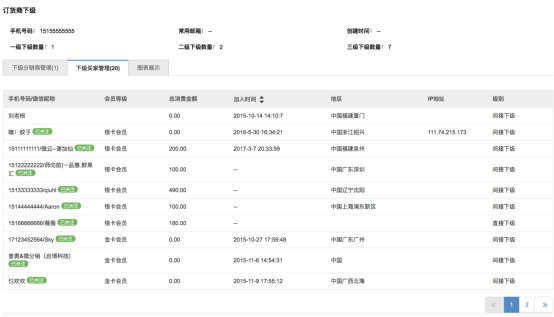 【优化】优化订货商手机端中心界面: ① 显示下级会员:一条线上的下级会员; ② 显示下级订单:能拿到差价的下级订单; ③ 显示下级订货商:他的下级订货商; ④ 显示下级虚拟订单:包括直属下级会员购买的虚拟订单和下级订货商购买的虚拟订单。