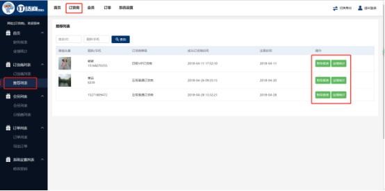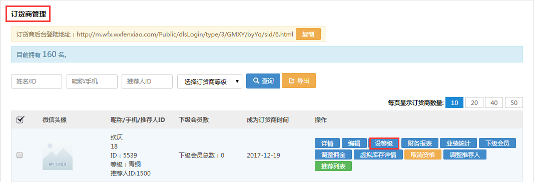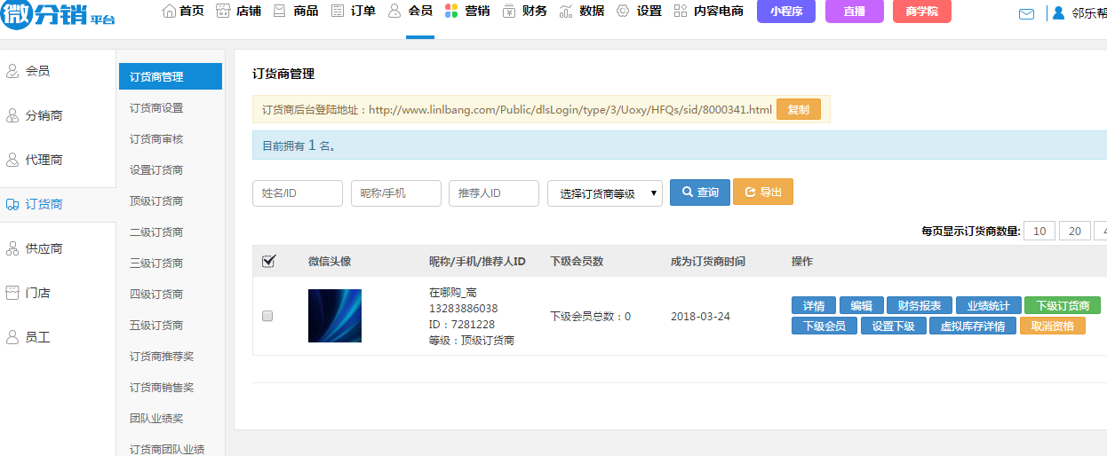 1.点击订货商管理,可看到目前统计的订货商的数量,通过查询列表,根据姓名/ID、昵称/手机、订货商等级可查询订货商。通过订货商列表,可以查看订货商详情、编辑订货商信息、取消订货商资格。