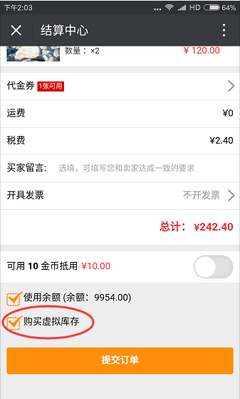 点击库存:可查看所购买商品的虚拟库存详情;点击立即发货,跳转到结算页面,设置好信息,提交订单,该订单处于代发货状态;