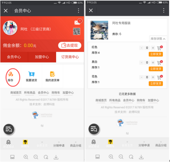 订单交易完成后,发放佣金,可以在财务-订货商佣金中查看。 订货商出货订单不统计销量; 删除,关闭订货商发货订单,商品会返还到订货商虚拟库存。 ① 手机端会员中心