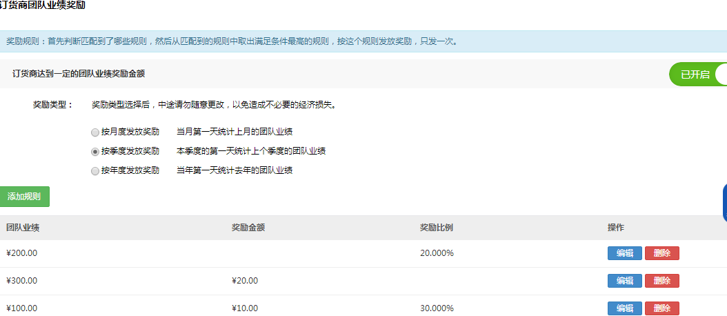 订货商业绩奖励规则添加/编辑规则时,增加奖励比例,奖励金额和比例都设置的话优先金额。