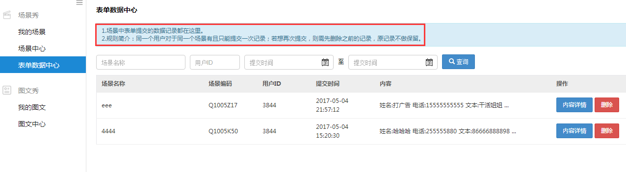 注: 同一个用户对于同一个场景有且只能提交一次记录;若想再次提交,则需先删除之前的记录,原记录不做保留。