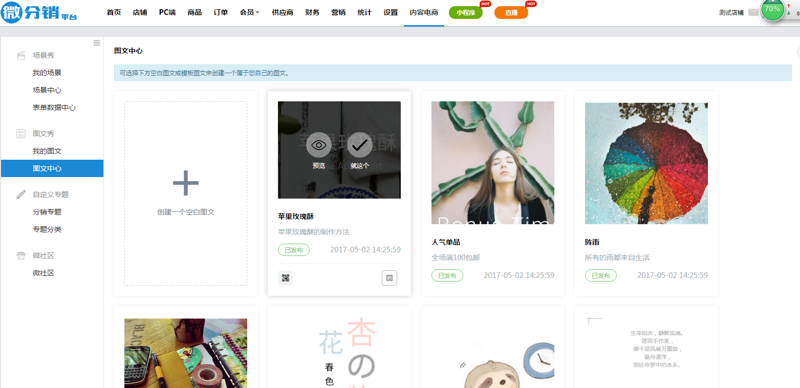 图文中心:有很多个图文,可选择空白场景或模板场景来创建一个属于您自己的图文。