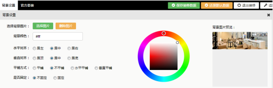 点击“首页装修”进入到装修页面。 首先,背景设置,主要是设置页面的背景颜色与背景图片。具体操作请对照操作界面进行。如下图所示:
