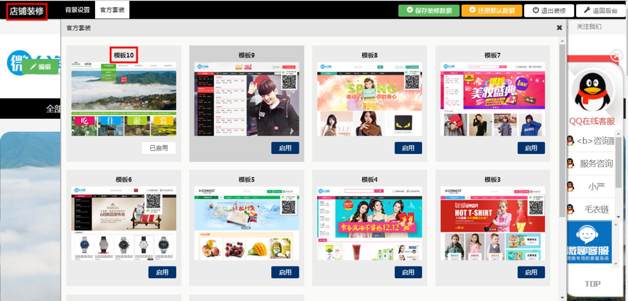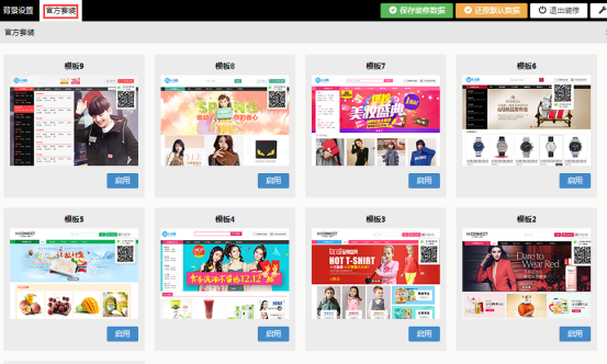 点击“官方套装”进入到系统默认的模板选择页面。用户根据自身需求选择,点击“启用”。