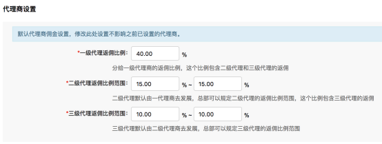 商家根据自身要求,设置代理商的返佣比例。(注:修改此处设置不影响之前已设置的代理商)。