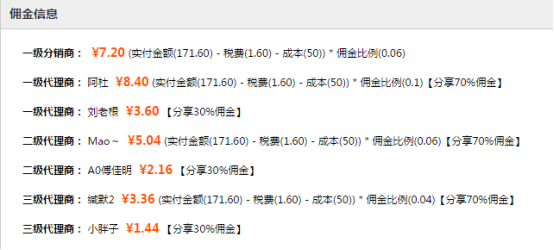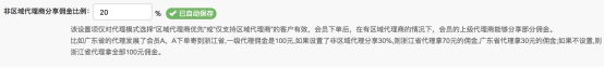 注:会员下单后,在没有区域代理商的情况下,即便设置了“非区域代理商分享佣金比例”,会员的上级代理商也拿全部的佣金。 会员下单后,在没有上级代理商的情况下,即便设置了“非区域代理商分享佣金比例”,区域代理商也拿全部的佣金。