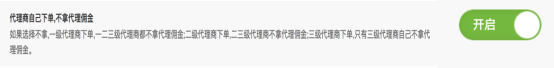 默认是关闭状态。开启后,一级代理商下单,一二三级代理商都不拿代理商佣金;二级代理商下单,二级和三级代理商不拿代理佣金;三级代理商下单,只有三级代理商自己不拿代理商佣金。