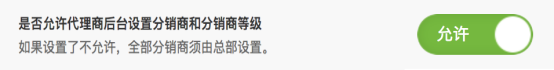 默认是不允许状态,开启后,代理商可在他的后台设置分销商和分销商等级。