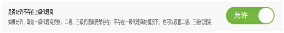 默认是不允许。开启后,取消一级代理商的资格。二级和三级代理商仍然存在。 没有的一级代理商的情况下,同样可以设置二级,三级代理商。